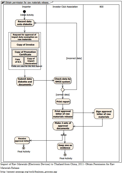 1. To obtain an exemption from the import duty on raw materials, the importer submits a request in a form of a diskette to the Investor Club Association, together with other relevant documents, namely a Request for Import Duty Exemption on Raw Materials, a copy of the import Invoice, a copy of the Promotion Certificate and a copy of the Import Declaration in case a bank guarantee or the BOI membership right reservation for import duty exemption is being used for release of raw materials. Additionally, copies of the A/L and B/L are necessary for the first request for raw materials release. 2.The Investor Club Association checks the submitted data using the Raw Material Tracking System (RMTS). If the information is incorrect, the forms are returned to the importer for modification. 3. If the information is correct, the Investor Club Association prints a report and an approval letter for raw material release, which are then given for signature to the BOI authority stationed at the Investor Club Association. 4.The Investor Club Association makes two sets of signed approval letters: one to be returned to the importer and the other to be kept as evidence by the Investor Club Association. When the electronic devices produced using these imported raw materials are exported, the exporter has to inform the inventory cut-off to the BOI to ensure that the imported raw materials are really used for manufacturing electronic products that will be exported. Documents: Request for Import Duty Exemption on Raw Materials, copy of import invoice, copy of Promotion Certificate (In case of request for raw materials release for the first time), copies of A/L & B/L (In case of request for raw materials release for the first time), Import Declaration (In case of using bank guarantee for release of raw materials or using the right reservation)