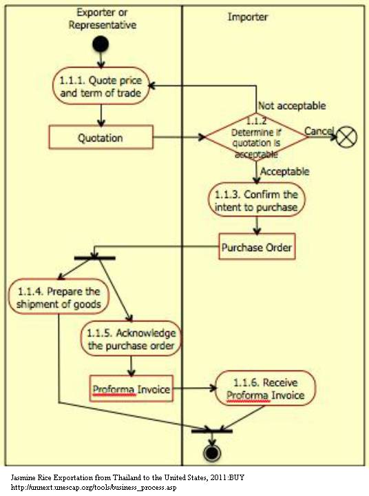 1. Exporter prepares Quotation to inform an importer about quoted price and sales terms. 2. Importer reviews the Quotation and determines if the quoted price and sales terms are acceptable. If the quoted price and sales terms are not acceptable, importer requests exporter to revise the quoted price and sales terms. 3. If the quoted price and sales terms are acceptable, importer confirms exporter the purchase of goods with Purchase Order. 4. Exporter prepares the delivery of goods accordingly. 5. Exporter acknowledges the receipt of Purchase Order and confirms that the jasmine rice will be delivered according to established conditions and terms by sending importer Proforma Invoice. 6. Importer receives Proforma Invoice.