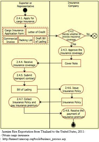 1. Under the CIF term, exporter is required to arrange cargo insurance. To apply for the insurance , the following documents have to be submitted to an insurance company. – Cargo Insurance Application Form – Letter of Credit – Commercial Invoice – Packing List – Draft Bill of Lading 2. Based on the submitted documents, insurance company decides whether or not to provide the insurance coverage. 3. If insurance company decides to provide the insurance coverage, insurance company issues Cover Note for the to-be-insured consignment as evidence to confirm that the insurance coverage is active. 4. Exporter collects Cover Note from insurance company. 5. Upon a receipt of Bill of Lading, Exporter hands one copy to insurance company 6. Insurance company then issues Insurance Policy. 7. Exporter collects Insurance Policy from insurance company and pays insurance premium. 8. Insurance company receives the payment for insurance premium.