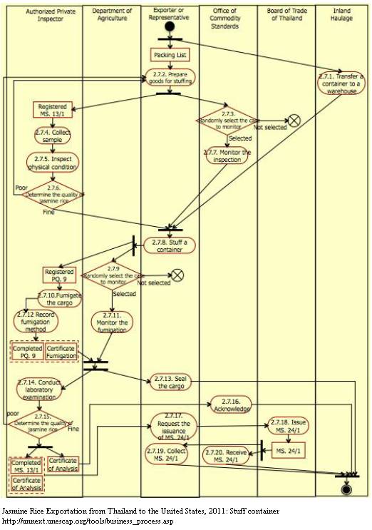 1. Driver of an inland haulage transfer an empty container to exporter‟s premise. 2. Exporter prepares jasmine rice to be stuffed according to the Packing List. 3. Officer from Office of Commodity Standards randomly selects the case to go monitor the inspection. 4. Authorized private inspector collects sample of jasmine rice from the consignment specified in registered MS. 13/1. When collect jasmine rice sample, authorized private inspector also keeps the sample for further inspection in a laboratory. The sample is divided into three portions. The first portion is for the authorized private inspector. The other two is for an exporter and Office of Commodity Standards to keep as a reference. The sample has to be delivered to Office of Commodity Standards in 7 days after the collection. 5. Authorized private inspector then inspects the physical condition of jasmine rice. 6. Authorized private inspector determines the quality of sampled jasmine rice based on the result of physical inspection. If the actual quality does not meet the condition specified in registered MS. 13/1, exporter has to bring in a new lot of jasmine rice. The new lot of jasmine rice is also subject to a similar inspection process. 7. In a selected case, officer from Office of Commodity Standards also monitors the inspection of jasmine rice‟s physical condition. 8. If the actual quality of sampled jasmine rice meet the condition specified in registered MS. 13/1, exporter can then stuff the jasmine rice into a container. 9. Officer from Department of Agriculture randomly selects the case to go monitor the fumigation. 10. When container stuffing is completed, authorized private inspector fumigates the cargo. The fumigation of jasmine rice in 20-foot container using Aluminium Phosphide costs 1,100 THB for the first container and 650 THB for the second container onward. The fumigation of jasmine rice in 20-foot container using Methyl Bromide costs 2,000 THB per container. Transportation fee is included. If the fumigation is not conducted during the working hours (8.00-17.00), overtime fee will be charged. The rate varies from 500-1,000 THB per shipment per day. 11. In a selected case, officer from Department of Agriculture also monitors the fumigation. 12. Authorized private inspector records the chemical and the method used in the fumigation in Registered PQ. 9 and issues Certificate of Fumigation. 13. Exporter then closes and seals the container after the fumigation is completed. 14. Authorized private inspector conducts a laboratory examination on sample jasmine rice and records the result of analysis in Registered MS. 13/1 and Certificate of Analysis. 15. Authorized private inspector determines the quality of sampled jasmine rice based on lab results. If the result of analysis informs that the quality of sample jasmine rice is below what has already been agreed upon by an importer, exporter has to bring in a new lot of jasmine rice. The new lot of jasmine rice has to go through activity 2.7.3 – 2.7.15 again until the laboratory examination yields desirable results. If the result of analysis is satisfactory, authorized private inspector completes MS. 13/1 and issues 2 copies of Certificate of Analysis. One copy of Certificate of Analysis is to be given to Office of Commodity Standards in 5 days after its issuance. Completed MS. 13/1 and original copy of Certificate of Analysis are to be given to exporter. According to Rice Export Manual prepared by Department of Foreign Trade, the inspection of jasmine rice from the first container costs 1,500 THB. From the second container onward, the service charge is calculated per ton. The costs inspection per ton is 18 THB. 16. Office of Commodity Standards acknowledges a receipt of Certificate of Analysis. 17. Exporter or representative then submits completed MS. 13/1 and Certificate of Analysis to officer from Board of Trade of Thailand to request the issuance of Certificate of Product Standards (MS. 24/1). 18. An officer from Board of Trade of Thailand issues three copies of MS. 24/1. The last copy is to be kept by Board of Trade of Thailand. The issuance of MS. 24/1 for exporter costs 100 THB. 19. The first copy is to be collected by exporter. 20. The second copy is to be sent to Office of Commodity Standards.