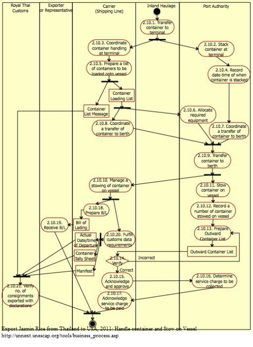 1. Driver of inland haulage transfers the container to the location in the terminal specified in Equipment Interchange Receipt. 2. Port staff stacks the container at the terminal using the equipments that have already been prepared after issuing the Equipment Interchange Receipt towards the end of “transfer to port of departure” business process. 3. Carrier agent coordinates the handling of container at the terminal with port staff. 4. Port staff then records date and time when the container is stacked. 5. Carrier agent prepares Container Loading List for Port Authority and Container List Message for Royal Thai Customs. The content of these two documents is almost identical. These two documents have to be submitted to Port Authority and Customs three hours prior to the loading time. If there are changes in the list of containers, changes must be informed to relevant parties prior to the loading time as well. 6. Based on Container Loading List, Port staff, through the handheld device, allocates equipment necessary for transferring containers to berth. 7. Port staff coordinates with carrier agent on a transfer of container to berth. 8. Carrier agent coordinates with port staff on a transfer of container to berth. 9. Port staff transfers container from the terminal to berth. 10. Based on Container Loading List, carrier agent instructs port staff about the location of each container on a vessel. 11. Port staff stows containers on vessel according to carrier agent‟s instruction. 12. Port staff then records a number of containers stowed on vessel upon the completion of the task. 13. Based on Container Loading List and a number of containers stowed on vessel recorded, port staff prepares Outward Container List. 14. Carrier agent verifies Outward Container List received from port staff.. 15. Carrier agent acknowledges and approves the correct Outward Container List. If Outward Container List is incorrect, carrier agent needs to inform port staff about the revision needed. 16. Port staff determines port charges and informs carrier agent the amount of charges to be paid. 17. Carrier agent then acknowledges the amount of service charge to be paid to Port Authority. 18. Once all the containers are on board, carrier agent issues Bill of Lading for an exporter. 19. Exporter receives Bill of Lading from carrier agent. 20. Carrier agent is also required to fulfill customs data requirements by submitting the following items in customs format to customs information system. – The actual date and time of departure – Container Tally Sheet (within 72 hours after the departure) – Manifest (within 6 days after receiving Receive Control Number) 21. Once Customs officer receives Manifest from carrier agent, he or she verifies the information of containers on board with submitted Export declarations and Goods Transition It should be noted that in addition to Outward Container List, port staff summarizes container movement activities in Container Gate-in/Gate-out Report Message (CODECO) and Container Discharge/Loading Report Message (COARRI). These messages are sent to carrier agent every morning in either an EDI File or a Text File.