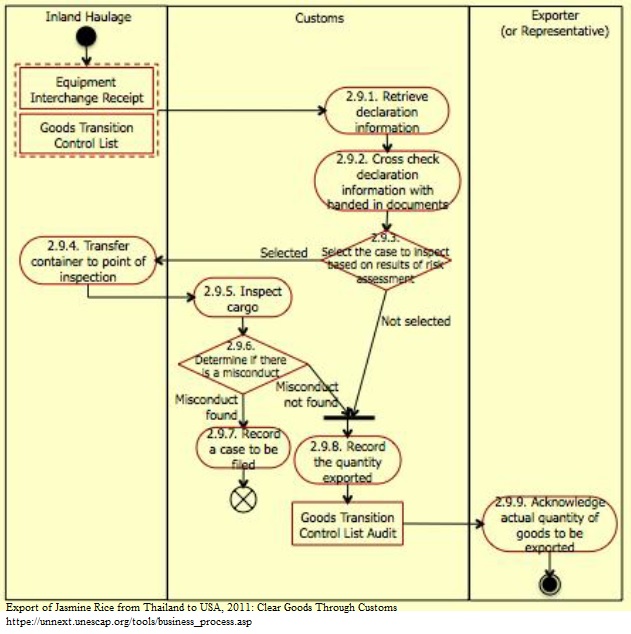 1. With a reference made to Equipment Interchange Receipt and Goods Transition Control List received from inland haulage‟s driver, officer from Royal Thai Customs retrieves information that exporter has declared. 2. Officer from Royal Thai Customs crosses check information that has been declared with information in Equipment Interchange Receipt and Goods Transition Control List. He or she needs to make sure that the container to be exported is identical to the container that exporter has declared in Goods Transition Control List. 3. Based on the results of risk assessment, officer from Royal Thai Customs determines whether to inspect the cargo. If the e-Export system indicates that the consignment is not subject to further inspection, officer from Royal Thai Customs can go to activity 2.9.8 and release the consignment from Sub-Gate right away. The actual quantity of goods to be exported is recorded as part of Goods Transition Control List Audit in the system. 4. If officer from Royal Thai Customs decides to inspect the cargo, driver of inland haulage has to move the containerized cargo to point of inspection. 5. Officer from Royal Thai Customs then inspect the containerized cargo. 6. Officer from Royal Thai Customs determines if there is a misconduct. 7. If there is a misconduct found, officer from Royal Thai Customs records a misconduct case which requires further investigation. 8. If misconduct is not found, officer from Royal Thai Customs can release the containerized cargo from the Sub-Gate right away. The actual quantity of goods to be exported and released date are then recorded as part of Goods Transition Control List Audit in the system. 9. Upon the release of the containerized cargo from Customs-controlled area, exporter will be notified of the actual quantity of goods to be exported.
