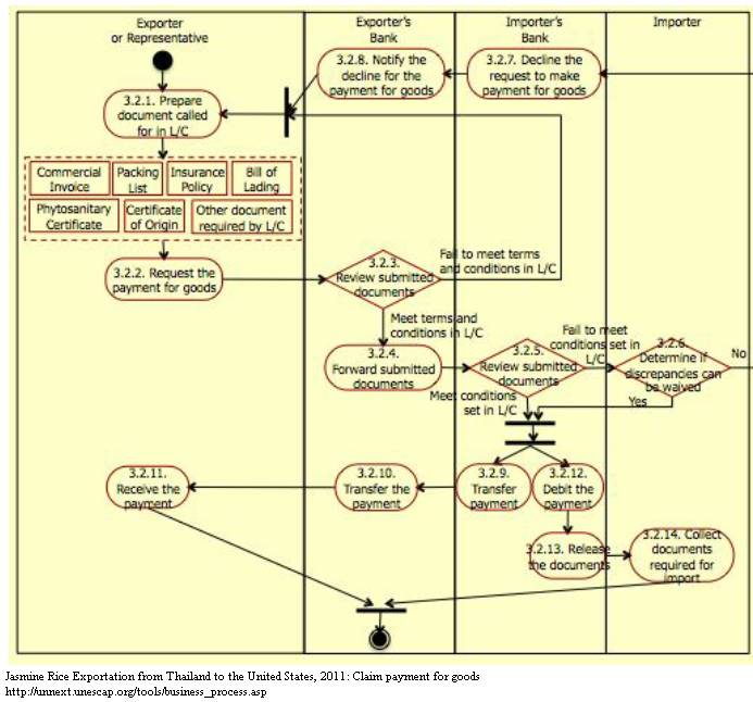 1. Exporter also prepares documents called for in Letter of Credit. Those documents typically include: – Commercial Invoice, – Packing List, – Insurance Policy, – Bill of Lading, – Phytosanitary Certificate, and – Certificate of Origin. 2. With the documents called for in Letter of Credit, exporter requests exporter‟s bank to advise importer‟s bank to proceed the payment for goods. 3. Exporter‟s bank reviews submitted documents and determines if they are compliant with the terms and conditions as listed in Letter of Credit. If they do not meet the terms and conditions in Letter of Credit, exporter‟s bank informs exporter about the discrepancies. In this case, exporter needs to make necessary corrections. 4. If the submitted documents meet the terms and conditions as listed in Letter of Credit, exporter‟s bank forward them to importer‟s bank. 5. Importer‟s bank reviews submitted documents and determines if they are compliant with the terms and conditions of Letter of Credit. If they do not meet the terms and conditions in Letter of Credit, importer‟s bank informs importer about the discrepancies. 6. Importer determines if discrepancies can be waived. 7. If importer does not waive the discrepancies, importer‟s bank declines the request to make payment for goods. 8. Exporter‟s bank notifies exporter about the decline for the payment for goods so that exporter makes necessary corrections. 9. If importer‟s bank finds the submitted documents compliant with the terms and conditions listed in Letter of Credit from the very beginning, importer‟s bank transfer the payment for goods to exporter‟s bank. 10. Exporter‟s bank transfers the payment for goods to exporter. 11. Exporter receives the payment for goods. 12. Importer‟s bank debits the payment for goods from importer‟s account. 13. Importer‟s bank releases documents collected from exporter. 14. Importer collected documents required for import.