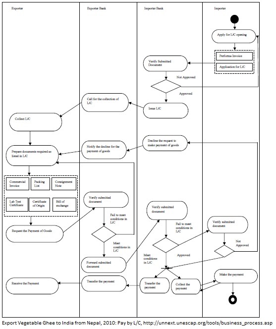 1. An L/C is opened in the importing bank and transferred to the exporter through the exporter's bank. The L/C guarantees payment for the goods under specific conditions to be followed by the exporter. 2. Upon receipt of the L/C, the exporter dispatches the cargo in accordance with the conditions stipulated in the L/C. 3. After dispatching the cargo, the exporter prepares the documents as required by the L/C and submits them to the bank for payment. 4. If all documents are correct as per instructions from the importer's bank, the exporter's bank makes the payment to exporter by honouring the L/C.