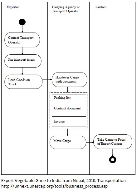 1. The exporter contacts a transport company and negotiates transport of the goods. 2. Following this, the goods are loaded in truck or container and the relevant documents, including the packing list, contract document and commercial invoice are given to the transport operator.