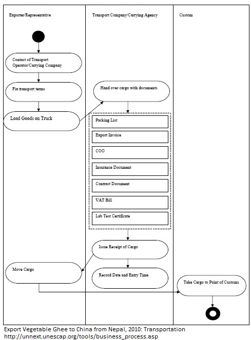 1. The exporter contacts a transport company/operator and negotiates the cost of the freight. 2. The process for transporting the goods to the customs point in Kodari is similar to the process described in the previous section about transporting goods to the Nepal-India border.