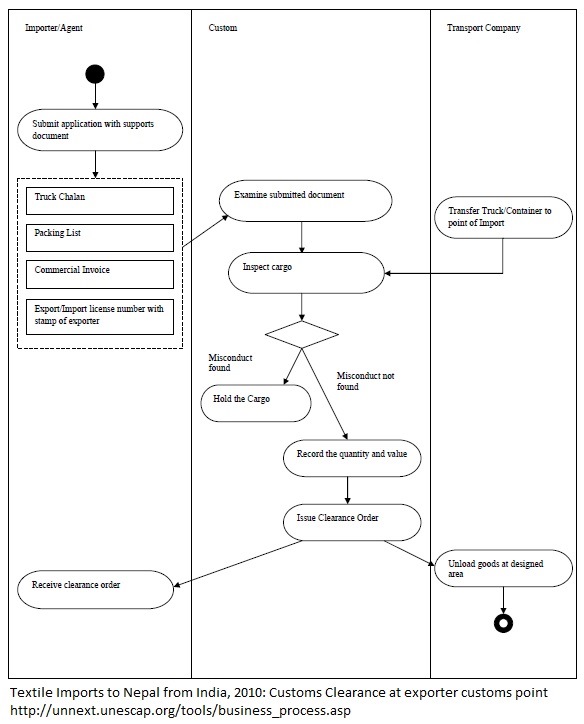 1. For customs clearance at the India-Nepal (departure) border, the importer's agent submits the required documents, including the commercial invoice, packing list, truck chalan and export licence number (with the exporter’s stamp) 2. Customs personnel examine the documents and inspect the cargo 3. After completion of the inspection, customs records the quantity and value of the goods exported and permission is given to move or unload goods at the designated area 4. The importer's agent completes the import declaration form and submits it to the customs office along with the required documents 5. The customs official examines the documents and inspects the cargo. If satisfied, the quantity and value of the imports are recorded in the customs records 6. Then the importer's agent is asked to pay the charges 7. Once the charges have been paid, permission is given to move the goods. The transport operator then moves the cargo to the destination and the importer's agent collects the custom clearance form