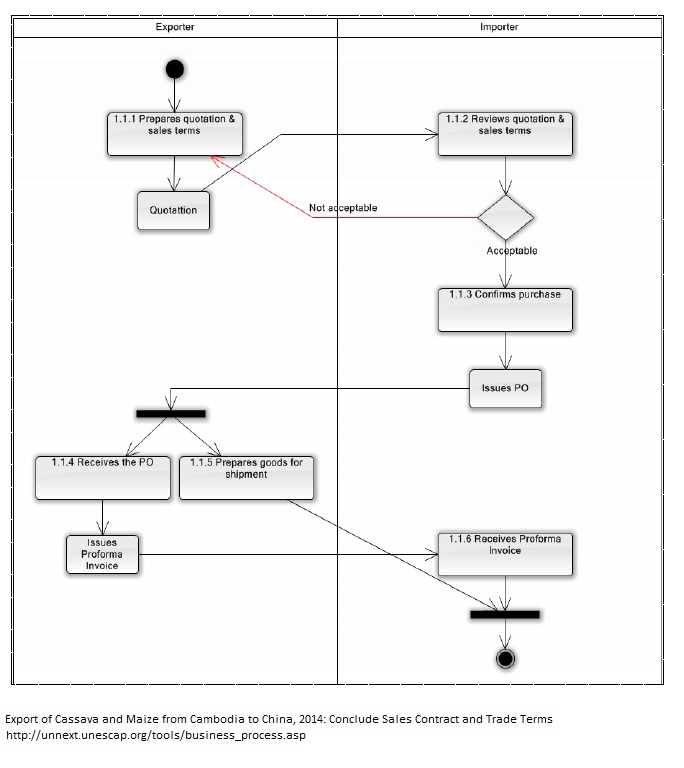 1 Exporter prepares quotation and sales terms, sent it to importer. 2 Importer reviews the quotation and sales terms, determines if they are acceptable. If not, importer may request a revised quoted price and sales terms. 3 Importer confirms the purchase, issues Purchase Order to exporter. 4 Exporter issues Proforma Invoice after receiving the PO. 5 Exporter prepares goods for shipment. 6 Importer receives Proforma Invoices.