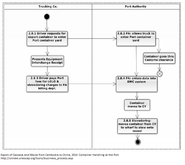 1 Driver presents the Equipment Interchange Receipt at gate and request to enter Port container yard. 2 Port Authority’s officer allow truck to enter Port container yard, container goes thru Customs clearance. 3 Driver proceeds to pay port fees for loading and unloading container and stevedoring charges to the Port Authority Billing Department. 4 Port Authority’s officer enters data into Single Window Computer System, which to inform the Stevedoring Department to proceed with loading and unloading. The data is also share with the carrier (shipping line) to prepare a “load list” for the cargo. 5 Port Authority’s worker moves the container from container yard to the wharf to stow onto the vessel.