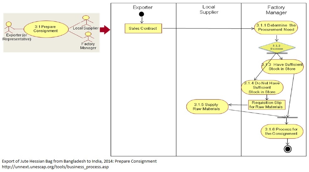 1 Exporter gives the sales contract to factory manager. 2 The factory manager checks whether there is sufficient stocks in the warehouse or new production is needed. 3 If sufficient stocks are available, the factory manager starts the process for shipment of the consignment. 4 If stocks are not sufficient, the manager issues requisition slip for collecting raw materials (jute) to make jute hessian bags. 5 Raw materials are collected and processed. 6 The consignment is processed (either with the available stock or with new supply).
