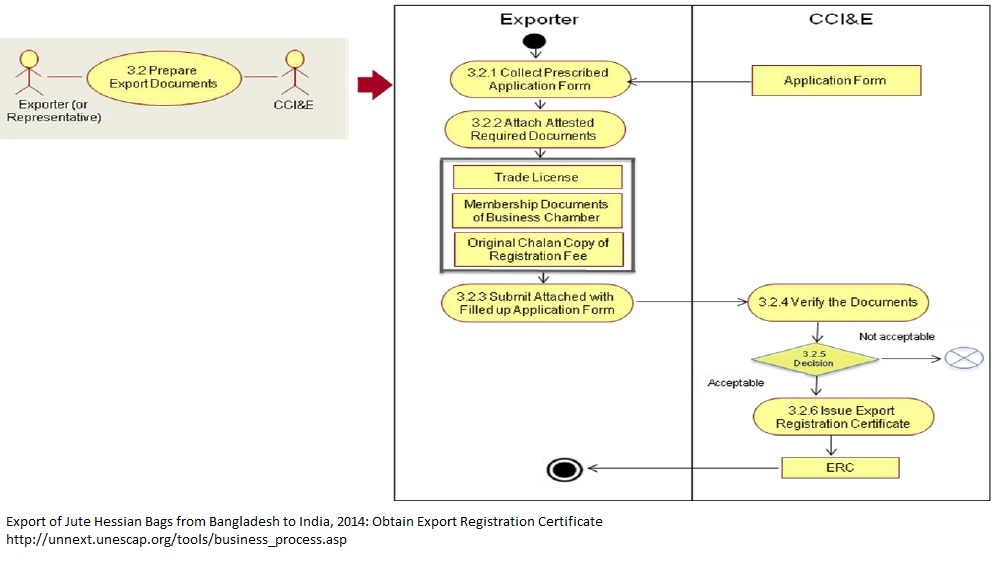 1 The exporter collects prescribed Application form for export registration. 2 Exporter fills in the form and attaches the following documents- trade license, membership documents of Business Chamber and original chalan copy of registration fee. 3 The exporter submits the application form to the office of CCI&E attached with all necessary documents. 4 The office of the CCI&E verifies the documents. 5 Based on the submitted documents, the CCI&E decides whether to accept or reject the application. 6 If satisfied with the documents the CCI&E issues Export Registration Certificate to the exporter