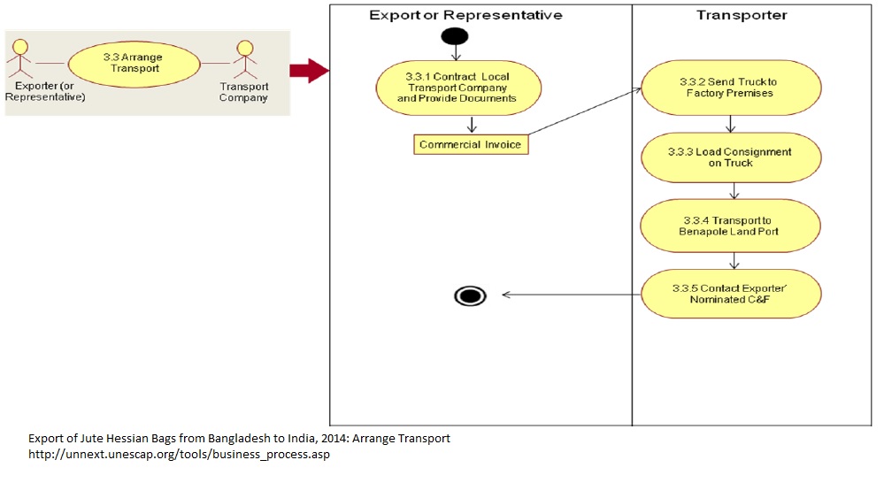1 Exporter reaches a contract with a local transport company and hands over documents. 2 The transport company sends trucks to the factory premises. 3 The consignment is loaded on the trucks. 4 The consignment is transported to the Benapole Land Port 5 After reaching Benapole Land Port the transporter contacts exporter nominated C&F agent
