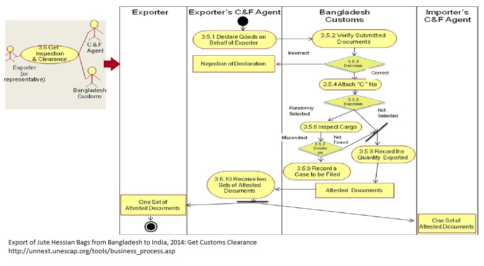 1 Exporter’s C&F agent declares goods on behalf of the exporter. 2 The Customs Authority verifies the submitted documents. 3 Based on the verification the Bangladesh Customs Authority decides whether to issue “C” form or not. 4 If the documents are satisfactory, then the Customs Authority attaches a clearance number (“C” number) with the submitted documents. 5 After attaching “C” number the Customs Authority may directly send the consignment for recording the quantity of export or send randomly selected samples for inspection. In case of the former, activities 3.6.6 and 3.6.7 are skipped and in case of the latter, the consignment passes through activities 3.6.6 and 3.6.7. 6 The Customs Authority inspects the randomly selected samples from the consignment. 7 Based on the inspection of the samples the Customs Authority gives decision. 8 If no fault is found the consignment is sent for recording the export quantity. After recording the quantity, attested documents are returned to the C&F agent. 9 If any misconduct is found, then a case is filed against the exporter. 10 The C&F agent sends one set to the C&F agent of the importer and the other to the exporter.