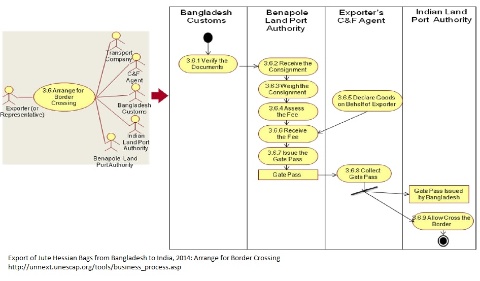 1 Bangladesh Customs verifies the documents and sends attested documents to Benapole Land Port Authority. 2 Benapole Land Port Authority receives the consignment. 3 Benapole Land Port Authority weighs the consignment 4 Benapole Land Port Authority charges the fees. 5 The exporter’s C&F agent declares the good on behalf of the exporter and deposits the fees. 6 Benapole Land Port Authority receives the fees. 7 Benapole Land Port Authority issues the gate pass. 8 The exporter’s C&F agent collects the gate pass and gives it to the Indian Land Port Authority through the importer’s C&F agent. 9 Using the gate pass the consignment crosses the border and enters the Indian territory