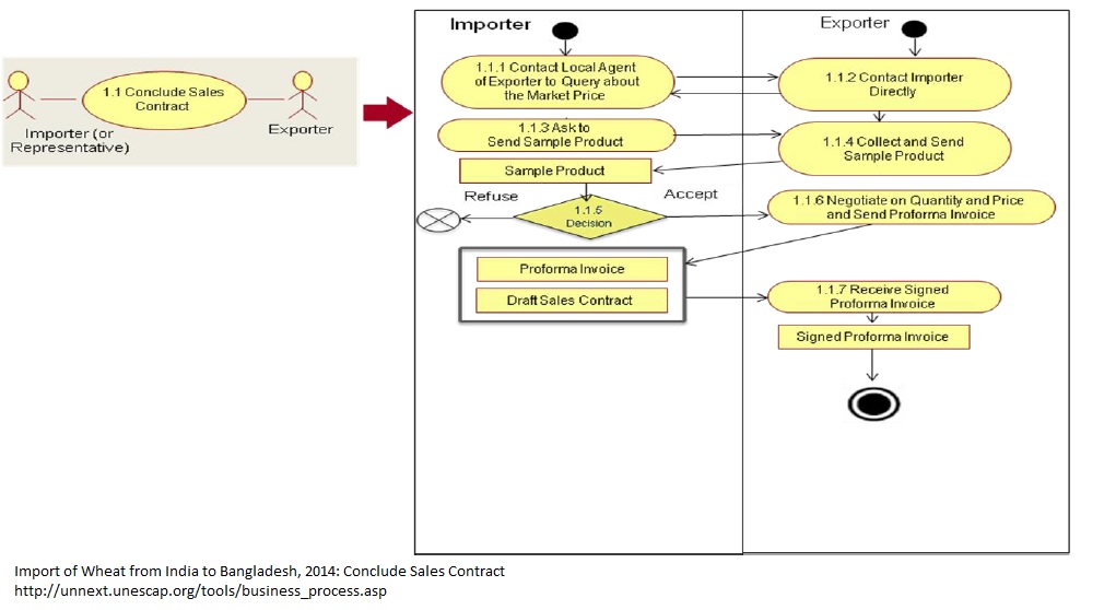 1. The importer contacts local agent of Indian exporter to query about the market price of wheat in India. 2. The Indian exporter may also directly communicate with the importer. In this process importer collects the contact details of the exporter. 3. The Importer asks the exporter to send samples. 4. Exporter collects various types of products and sends sample products to importers. 5. The importer chooses the right quality from the samples of wheat sent by the exporter. If none of the samples is acceptable, the importer refuses to import. 6. Exporter negotiates on quantity and price and accordingly send proforma invoice and draft sales contract to the importer. 7. The importer signs the sales contract and proforma invoice and sends back to the exporter.