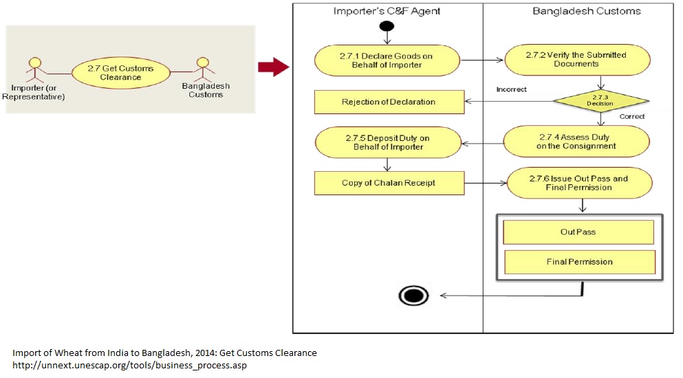 1. Importer’s C&F agent declares goods on behalf of the importer. 2. The Customs Authority verifies the submitted documents. 3. The Customs Authority is not satisfied with the documents, they reject the application for clearance. If the documents are satisfactory, then the Authority decides to assess the duty on the consignment. 4. The Customs Authority determines the duty on the consignment. 5. Importer’s C&F agent deposits duty on behalf of the importer and receives chalan receipt for the deposit. 6. After getting the chalan receipt of the duty deposit, the Customs Authority issues the ‘out pass’ and final permission and delivers these documents to the C&F agent.