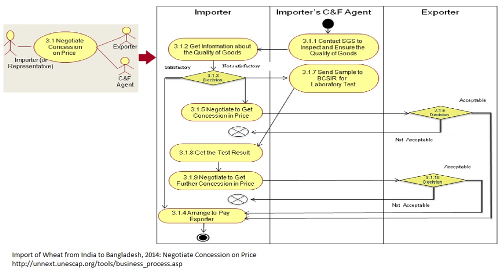 1. The C&F agent contacts the SGS to inspect and ensure the quality of the product. 2. The importer receives information about the quality of the product. 3. The importer takes decision on whether or not to pay according to contract depending on the quality of product after arrival. 4. If satisfied with the quality, the importer makes arrangement for the payment according to the contract. 5. If not satisfied with the quality, the importer starts negotiation with the exporter regarding concession on price. 6. If the newly offered concessional price is not acceptable to the exporter then the process ends there and they may decide what to do with the consignment. If the concessional price is acceptable to the exporter then he informs the importer and importer arranges the payment. 7. If the importer is not satisfied with the quality, he may decide to make formal test of the quality of product before taking any decision. The importer sends samples of the product to BCSIR for laboratory test. 8. Importer gets information of the quality of the product after the laboratory test. 9. With the formal test results of the quality of the product, the importer may decide to negotiate further with the exporter for concession on the price of the product. 10. The exporter decides whether or not to cater to the concession request of the importer. If the offered concessional price is not acceptable to the exporter then the process ends there. If the concessional price is acceptable to the exporter then he informs the importer and importer arranges the payment.