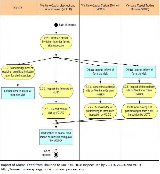 1. VCLFD sends a letter to the importer expressing interest for farm's site inspection 2. Upon mutual agreement on the date and time, a site visit is undertaken by the VCLFD, VCTD, VCCD 3. Following the site visite, VCLFD and VCTD prepare the import permission certificate stating the annual permitted quota of animal feed import by the farm.