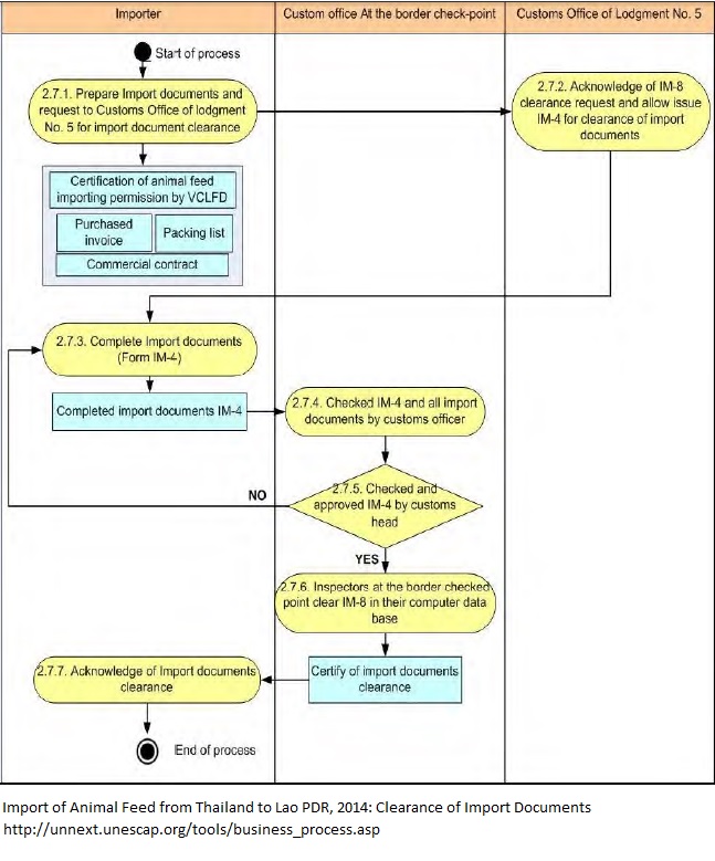 - Decree on Import and Export of Goods No. 114/GoL; Vientiance Capital, date 6 April 2011 - Notification on prohibited goods on import or export, No. 0973/ MoIC.DIMEX, Vientiane Capital, 25 May 2011; Dr. Nam Viyaket, Minister of Ministry of Industry and Commerce - Certification of animal feed importing permission by VCLFD - Purchased invoice - Packing list - Commercial contract - Completed import documents IM-4