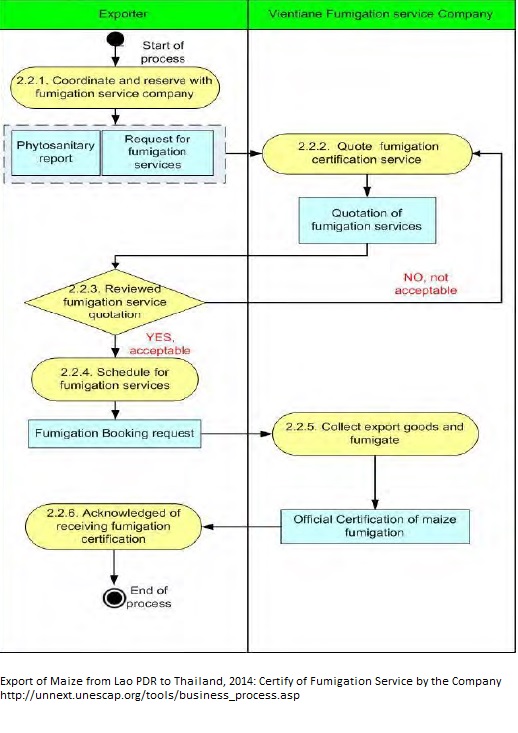 1. The exporter coordinated and reserved with fumigation service company along with the following documents (i) Phytosanitary report and (ii) Request for fumigation services; 2. The private company quoted fumigation certification service charge by sending "Quotation of fumigation services" to the exporter for consideration; 3. The exporter reviewed fumigation service quotation through the negotiation process; 4. If both had common agreement, the schedule for fumigation services would take placed; at this time the exporter submitted confirmed "Fumigation Booking request" to the company. 5. The fumigation company collected maize export goods, fumigated and certified fumigation completeness by sending "Official Certification of maize fumigation" to the exporter. 6. The exporter acknowledged of receiving fumigat Documents: -Maize fumigated record -Fumigation certification by company