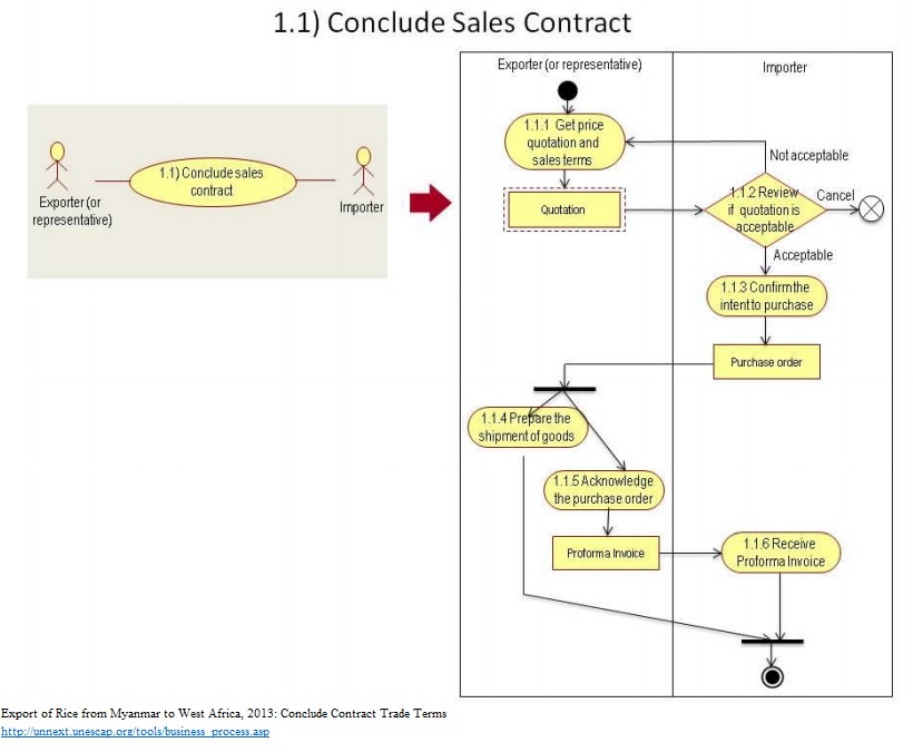 1 Exporter prepares a quotation to inform potential buyers (importers) about price and sales terms. 2 Importer reviews the quotation and determines if the quoted price and sales terms are acceptable. If the quoted price and sales terms are not acceptable, importer negotiates with the exporter. 3 If the quoted price and sales terms are acceptable, the importer confirms the purchase of goods with a purchase order. 4 Exporter prepares the delivery of goods accordingly. 5 Exporter acknowledges the receipt of the purchase order and confirms that the rice will be delivered according to established conditions and terms by sending the importer a proforma invoice. 6 Importer receives the proforma invoice.
