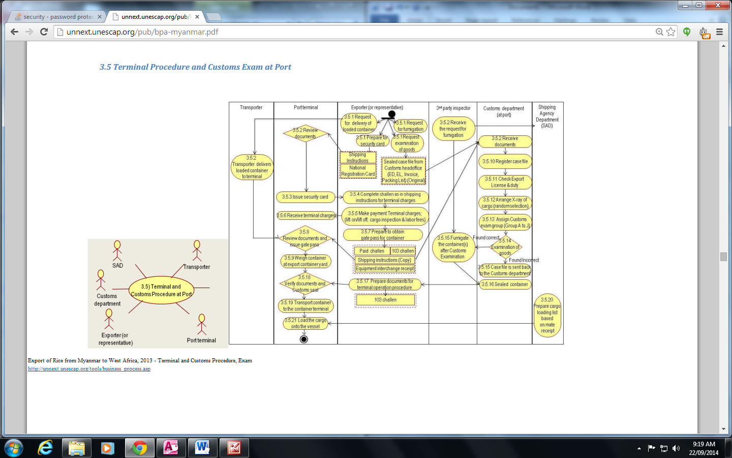 1 Exporter - Requests Customs to examine the goods - Requests transporter to deliver the loaded container to the Customs yard. - Requests to fumigate the goods (by 3rd party inspector) - Prepares required documents for security card. 2 - The respective parties receive the exporter’s requests (including necessary documents). - The port terminal gate officer reviews the submitted documents. - The transporter delivers the loaded container to the Customs yard at the port. 3 The gate officer at the port terminal issues the security card for the exporter. 4 Exporter lodges challen as per shipping instructions for terminal charges. 5 Exporter pays terminal charges such as lift on/off, cargo inspection and labor fees, etc. 6 Port terminal receives terminal charges and signs the receipt. 7 Exporter prepares documents to obtain a gate pass for the container. 8 - Gate officer at the port reviews the submitted documents and issues a gate pass. - Exporter brings all documents to Customs office at the port. 9 Loaded container(s) are weighed and checked against the shipping instruction at export container yard. 10 Customs at the port registers the submitted case file. 11 Appraisal Officer from Customs checks the cargo against the Export License. 12 Assistant Director arranges cargo check at X-ray. The shipments are randomly selected. 13 Customs exams group (Group A to J) is assigned by Chief Executive Officer. 14 Assigned Customs exam group examines the goods. 15 If the goods pass the Customs’ requirements, A third party inspector team fumigates the container after the Customs examination. If the goods do not meet the Customs’ requirements, port terminal customs send the case file to customs department. 16 After fumigating, exporter proceeds with buying a Customs seal to seal the container. 3.5.9 Container is sealed by Customs. 17 Exporter prepares document (103 challen) for the terminal operation procedure (lift-on/lift-off). 18 A representative of the export container yard verifies the submitted document and checks if all containers are correctly sealed with a Customs seal. 19 Port terminal transports the container to the container terminal. 20 The SAD prepares the cargo loading list based on the mate receipt. 21 The container(s) are loaded onto the vessel.