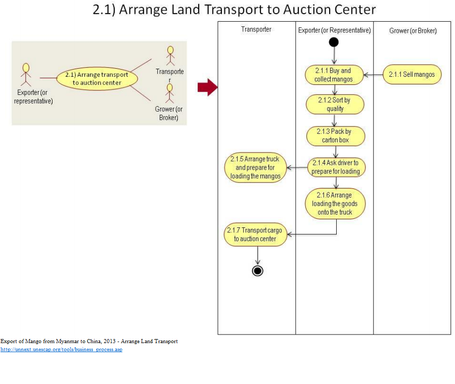 1 Exporter collects mangos from his own plantation (and buys additional fruits from growers/small traders). In some cases, mango growers also come to the exporter to sell their mangoes. 2 Exporter sorts the mango by quality. 3 After sorting, the exporter starts to pack the fruits in carton boxes. 4 Exporter requests the transporter to arrange the truck for loading. 5 Transporter makes the truck available. 6 Exporter arranges loading process. 7 Transporter brings the mangos to the auction center (Myanmar Vegetables & Fruits Exporter and Producer Association) at the border to sell the mangoes.