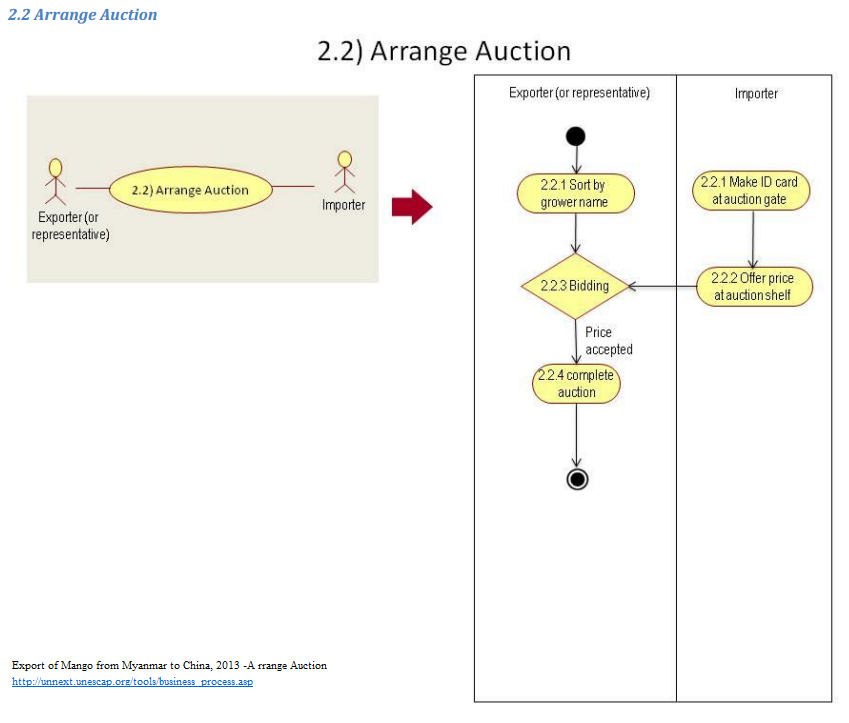 1 - The mangos are sorted by type and name of exporter. Before the auction, the kind of mango and name of exporter is announced to inform all auction participants. - All importers register at the auction gate to obtain an auction pass (pre-requisite to take part in the auction process). 2 Importers assess the value of the goods and make offers. 3 Bidding process. 4 The highest bidder gets the sale. 5 The exporter and importer agree on the offered price and complete the auction process (no contracts).