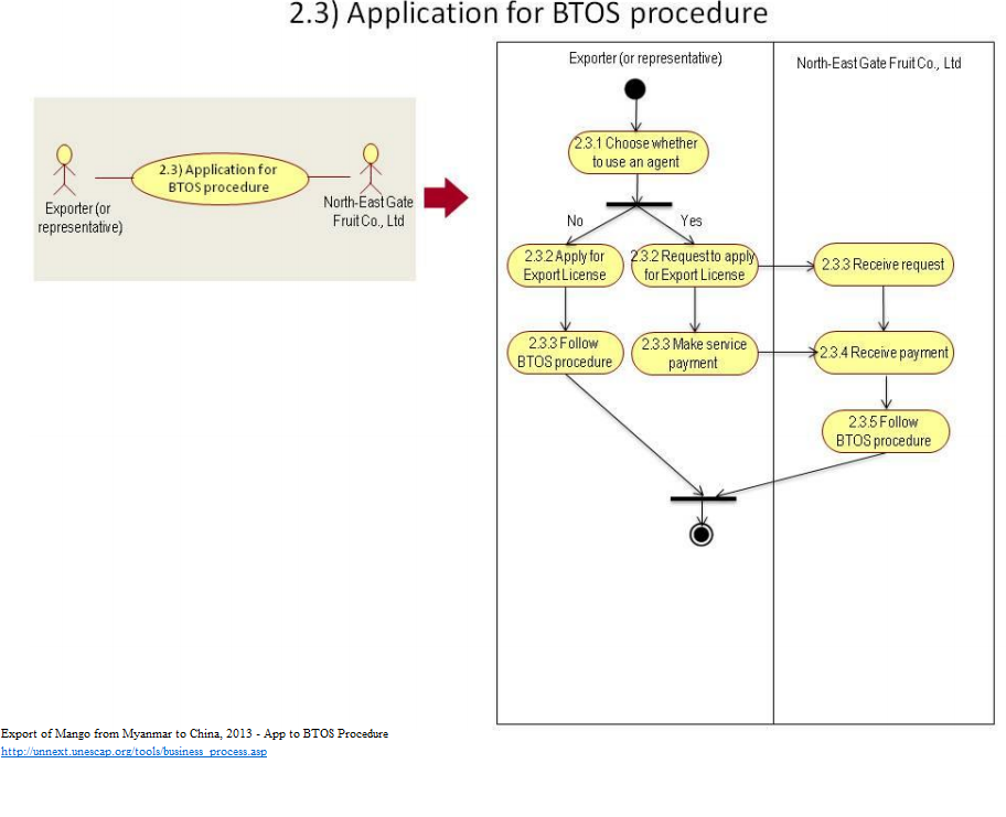 1 Exporter must decide whether to complete the process on his own or to use an agent (North-East Gate Fruit Co., Ltd). Option 1: Without agent: 2 Exporter applies for an Export License and CusDec. 3 Exporter follows the BTOS procedures. Option 2: Using an agent 2 The exporter requests the agent to apply for an Export License on the exporter’s behalf. 3 - The agent receives the request from the exporter. - Exporter make a payment for service charges. 4 The agent receives the payment. 5 The agent follows the BTOS procedure.