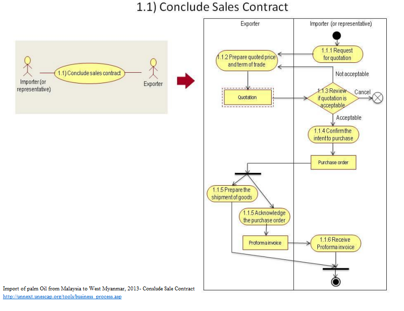 1.Importer requests a quotation from potential exporters. 2. Exporter prepares the quotation (price and sales terms). 3.Importer reviews the quotation and determines if the quoted price and sales terms are acceptable. If the quoted price and sales terms are not acceptable, importer negotiates with the exporter about revising the quoted price and/or sales terms. 4. If the quoted price and sales terms are acceptable, importer confirms the purchase of goods with a purchase order. 5. Exporter acknowledges the receipt of the purchase order and confirms that the palm oil will be delivered according to the agreed price and sales terms by sending the importer a proforma invoice. In addition, the exporter prepares the delivery of goods. 6.Importer receives the proforma invoice.