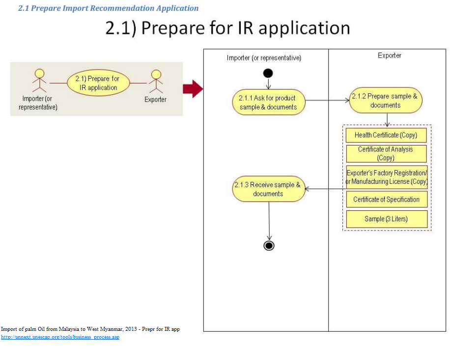 The import recommendation process is the first step in the import process. It is in fact a pre-approval to ensure that the goods imported fulfill health requirements in Myanmar. The importer (or representative) applies for the import recommendation only once the sales contract is concluded and if the importer does not have already an import recommendation. The import recommendation for palm oil is valid up to one year and does not need to be obtained again if the product specifications and supplier are the same. In order to prepare for the application, the importer needs from the exporter the following: - Health certificate of the originating country (copy) - Certificate of Analysis (copy) - Exporter’s factory registration or the manufacturing license (copy) - Certificate of specification - Palm oil sample (3 liters) All documents and the sample are sent via courier service. There are no costs incurred in this step (the exporter pays for the courier service). The whole process takes normally two days. 1. Importer asks exporter to send sample and documents for Import Recommendation application. 2. Exporter sends a 3-liter sample product and the documents requested (by Courier service). 3.Importer receives sample product and documents.