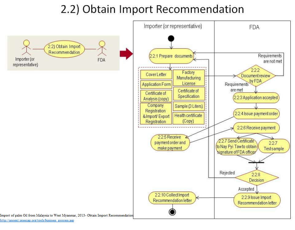 1. Importer prepares required document and submits online application at Myanmar trade net website. 2.Public access center (PAC) at MOC receives the submitted documents. 3.PAC checks accuracy and completeness of the online application. 4.If submitted documents meet all requirements, PAC gives order to make e-payment at Myanmar Citizen Bank (MCB). 5.Importer completes the e-payment. 7. Import section of MOC receives notification (or receipt) of e-payment. 8. PAC issues a hard copy of the online application and makes it available to the exporter. 9.Importer brings the hard copy of the Import License application to the Import section of the Ministry of Commerce in Nay Pyi Taw. 10.The Import section assesses the current market price of the products based on records of the Myanmar Edible Oil Association 11. Importer pays Import License fees via e-payment. 12.MCB receives the Import License fees. 13.MOC receives notification of Import License duty payment from MCB. 14.Import section of MOC issues Import License. 15. Importer collects the Import License. All documents required for the application are also submitted to the PAC. Those documents are: - Cover letter - Sales contract (original) or pro-forma invoice (original) - Statement of usage - FDA import recommendation - Health certificate from the exporting country - Representative card