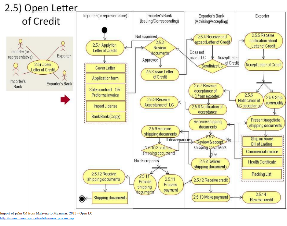1.Importer applies for a Letter of Credit (LC) at the importer’s bank. 2.Importer’s bank reviews all submitted documents and evaluates importer’s credit standing. 3. Importer’s bank approves the application, issues LC and forwards it to the exporter’s bank (advising bank). 4. Exporter’s bank receives the LC from his bank and reviews all the terms and conditions. 5.Exporter receives notification of the LC. 6. - Exporter notify the acceptance of LC to exporter’s bank. - The exporter reviews the terms and conditions. If the exporter believes that the importer can meet all terms and conditions, the goods are dispatched. The exporter then sends the shipping documents to the exporter’s bank. 7. - The exporter’s bank receives acceptance of LC from exporter and checks the shipping documents against the LC. - Exporter’s bank received shipping docs from exporter and reviews the shipping docs. 8. - If the documents meet the terms and conditions of the LC, the bank sends the shipping documents to the importer’s bank. - The exporter’s bank gives notification of acceptance to importer’s bank. 9.Importer’s bank receives shipping documents. 10. - Importer’s bank receives and examines the shipping documents. If the documents meet the conditions of the LC, they are released to the importer. - Importer’s bank receives acceptance of the Letter of Credit. 11. - The importer’s bank makes the payment to the exporter’s bank (credit). - The importer provides the shipping documents to the importer. 12. Exporter’s bank receives payment (credit) notification from importer’s bank. 13. Exporter’s bank transfers the payment to the exporter. 14.The exporter receives the payment from his bank.