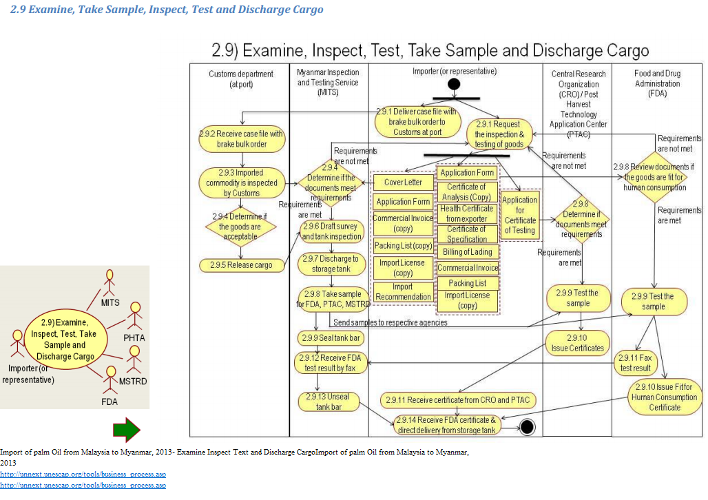 1. Importer delivers case file with break bulk order to onboard Customs at port and prepares documents required to submit to the Food and Drug Administration (FDA), Post-Harvest Technology Application (PHTA), Myanmar Science & Technology Research Department (MSTRD), and Myanmar Inspection and Testing Service (MITS) (under the control of MOC). 2. Onboard Customs receives case file from importer. 3. Onboard Customs conducts commodity inspection. 4. Onboard Customs officer determines if the inspection result meets the requirements. 5. MITS officer determines if the submitted documents meet the requirements. 6. If the requirements are met, onboard Customs allows the release of the cargo. 7. MITS inspectors take draft survey (quantity) and dry test inspection of the tank. 8. The cargo is discharged to storage tank. 9. MITS, who is an authorized inspector from MOC, issues an Inspection Certificate, and sends a palm oil sample to MSTRD, PHTA and FDA via the importer’s agent. - FDA, MSTRD and PHTA review the documents and sample test, and determine whether the oil (quality) meets all requirements. 10. - MITS seals the oil storage tank bar after taking the sample. - PHTA, MSTRD, and FDA test the goods and determine whether the goods are satisfactory. 11. PHTA and MSTRD issue certificate for cloud point level and color testing. FDA issues Fit for Human Consumption Certificate. 12. - Importer receives Certificate from MSTRD and PHTA. - FDA sends test result to MITS by fax and makes Fit for Human Consumption Certificate available to importer. 13. MITS receives FDA test result by fax. 14. MITS unseals the oil storage tank bar. 15. Importer receives FDA certificate and can start distribution.