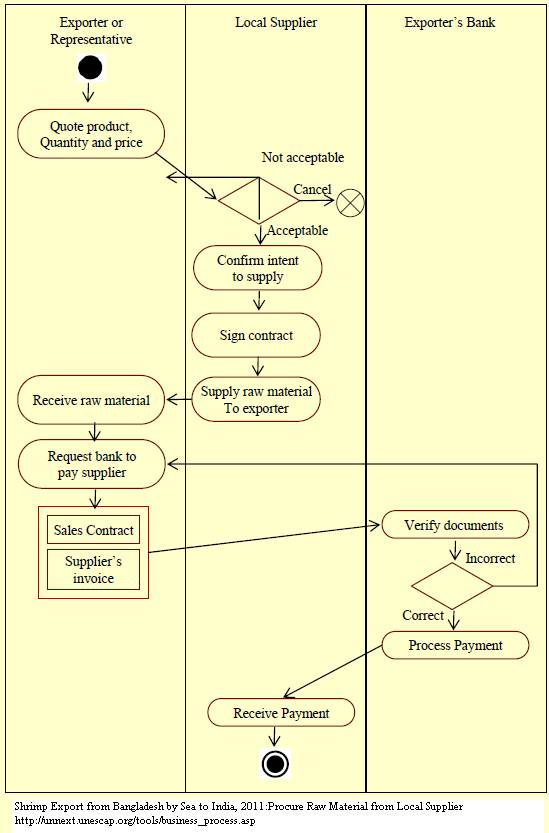 1. The exporter determines the quantity of shrimp to be procured from the local supplier(s). Having one or more preferred suppliers of shrimp is a common practice in the shrimp exporting business. 2. Generally, the suppliers’ firms are located within the vicinity of the exporter’s factory. 3. Based on the quantity, a price quote is served by the exporter to the supplier. Upon agreement on the terms and conditions, the supplier confirms an intent to supply and signs a contract with the exporter. 4. Once the delivery is made to the exporter’s premises, the exporter requests its bank to make payment to the shrimp supplier. For this, a copy of the sales contract and the supplier’s invoice are submitted to the bank. 5. The bank adjusts this payment at the end of the business cycle when final payment is received from the overseas buyer.