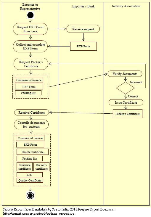 1. Firstly, the exporter fills in the EXP Form and then requests a Packer’s Certificate from the relevant industry association, which, in this case, is the Bangladesh Frozen Food Exporters’ Association (BFFEA) in Dhaka. This document, along with the EXP Form, Commercial Invoice, Quality Certificate, L/C, and Packing List are then compiled by the exporter to lodge a customs declaration.