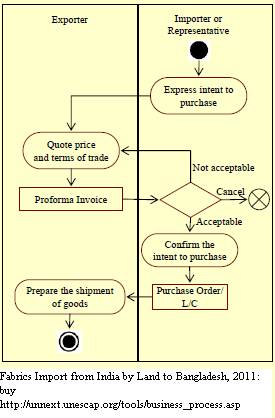 1.Based on the terms of the contract with the ultimate buyer of the RMG products, the RMG manufacturer in Bangladesh enters into a buying contract with an Indian exporter of cotton fabric who quotes the price and sends a Proforma Invoice for consideration by the Bangladeshi counterpart. If modifications are required, the document is returned to the exporter for necessary amendments. 2.Once both the parties agree on the terms, the importer from Bangladesh confirms intent to purchase. 3.An L/C is then opened by the importer and forwarded to the exporter’s nominated bank in India. The process of communication between the buyer and the exporter is mainly through exchange of emails and over the phone. If required, however, supporting documents are sent through courier services.