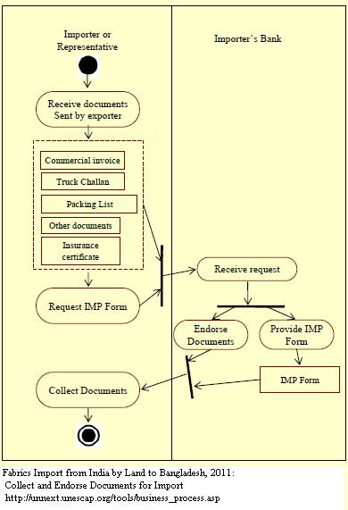 1. Collect and endorse documents for import . Once the exporter in India forwards the Commercial Invoice, Truck Challan, Packing List and Insurance Certificate to the importer in Bangladesh, the latter collects the Import (IMP) Form from its bank and also gets all the documentation endorsed by the bank. 2.Prepare other import documents. For import of cotton fabric, the documentation required includes the Utilisation Declaration (UD), which is issued by the business chamber, the BGMEA. This is a mandatory document to import raw materials for the RMG sector. 3.Copies of these documents are then forwarded to the CFA to lodge a customs declaration some time well ahead of the arrival of the consignment at the port.