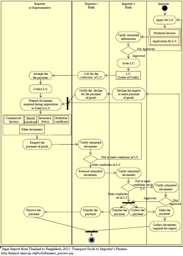 1. Having received the imported sugar as per the contract conditions, the importer directs the designated bank in Bangladesh to proceed with the payment. 2. The bank verifies the documents against the L/C terms. If no misconduct is found, the funds are transferred to the exporter’s bank in Thailand.