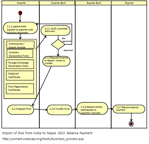 1. Importer applies for fund transfer with following document - Commercial/export invoice -Custom declaration document -PAN /VAT certificate -Firm registration certificate - Foreign exchange declaration form 2. Bank Verifies submitted document 3. If documents are approved bank requests importer to deposit the fund 4. Importer deposits fund 5. Fund transfer by importer bank to exporter bank 6. Exporter bank receives fund and transfers 7. Exporter receives balance payment