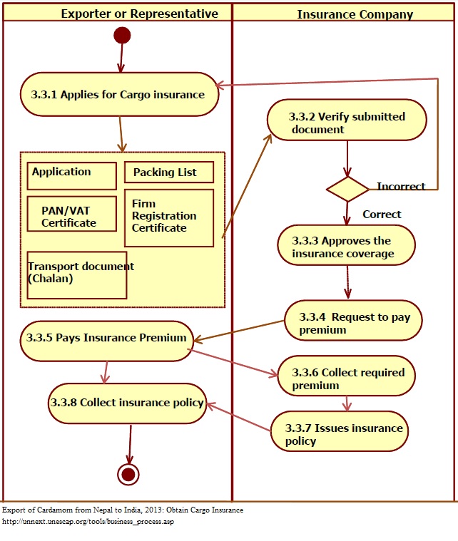 1 Exporter applies for cargo insurance with following documents - Application - PAN/VAT certificate - Firm registration certificate - Commercial /export invoice - Packing list - Transport document 2 Insurance company verifies the submitted documents. 3 If documents are correct insurance company decides to issue insurance coverage. 4 Insurance company requests exporter to pay premium 5 Exporter pays the premium 6 Insurance company collects the premium 7 Insurance company issues the insurance policy. 8 Exporter collects the insurance policy