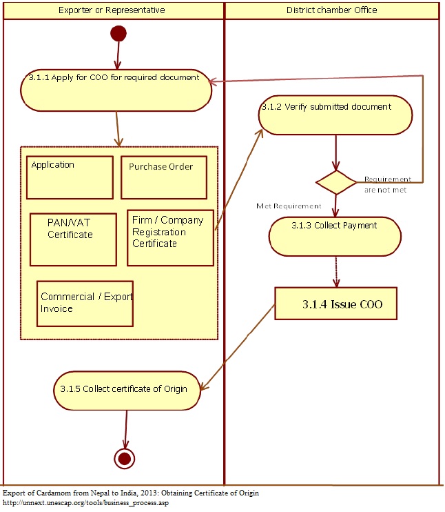 1 Exporter applies for COO in District Chamber Office. With following documents: - Application - purchase order - PAN/VAT certificate - Firm registration certificate - Commercial/ export invoice 2 DCO verifies submitted documents. If requirements met, DCO officials decide to issue the certificate 3 DCO collects fees from exporter or representative at the rate of 0.12 percent of export value. 4 DCO issues the COO 5 Exporter or representative collects COO
