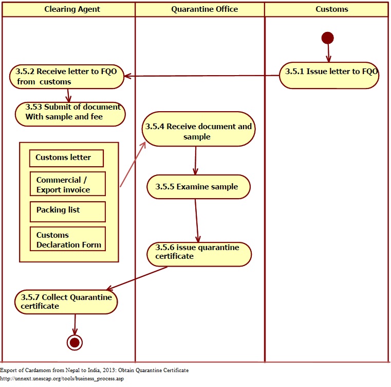 1 Custom Office issues a letter to FQO to examine the cargo for quarantine purpose. 2 Clearing agent receives letter to FQO from Custom Office. 3 Exporter's clearing agent submits sample and fee along with following documents. - Custom letter - Commercial /export invoice - Packing list - Custom declaration form 4 FQO receives document and examines the sample. 5 FQO issues quarantine certificate. 6 Clearing agent collects quarantine certificate