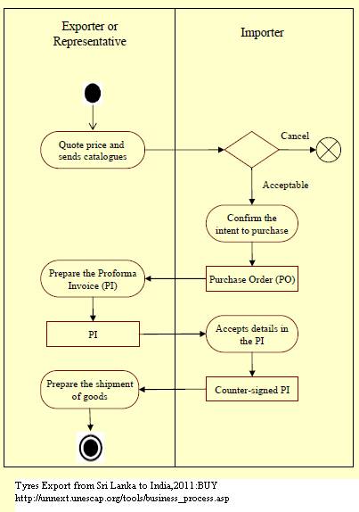 1. In the case of a regular client, the exporter quotes prices and terms of trade to the buyer via e-mail. In the case of a new buyer, the exporter first sends the sales catalogue and product designs to the buyer, after which prices are quoted and a sample of the requested tyre is sent. 2. When the buyer has decided to make a purchase, a Purchase Order (PO) is sent by the buyer (importer) to the exporter via email. The exporter raises a Proforma Invoice (PI) against the PO. The buyer is required to send a signed copy of the PI (by fax or post) if the method of payment is via telegraphic transfer. However, if the payment is made through Letter of Credit, this is not requested.
