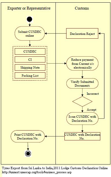 1. The CUSDEC is sent to customs by the exporter through the EDI, and the necessary payment (assessment charge of LKR 250) is deducted from the current account that the company has with the Customs Department. 2. Then an entry paid message is sent to the company (via email), with the customs declaration number. A printout of the CUSDEC and copies are then made.