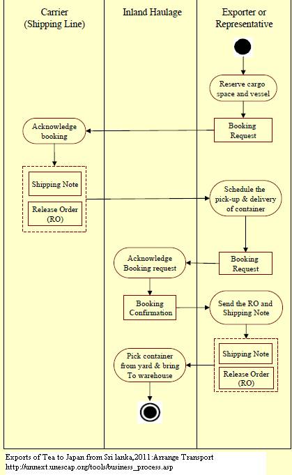 1. One exporter makes the initial reservation verbally, followed by a formal booking request. 2. The shipping line then issues a Shipping Note and a Release Order (RO). 3. The exporter sends the Shipping Note along with the RO to the inland transport agent to collect the container from the yard. The RO is usually faxed. 4. Then the agent collects the container from yard and brings it to the warehouse after which loading is carried out. Since the RO has the customs entry number, no other approval is needed to transport the container from the yard to the warehouse/factory and then to the port. Some companies opt to use an intra-system in making its shipping line bookings.