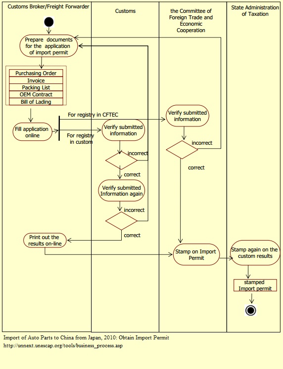 1. Based on the information in the purchasing order and the OEM contract, the company fills an online application form for the Customs Department and the Committee of Foreign Trade and Economic Cooperation (CFTEC). 2.The Customs Department will take two to three days to verify the information and will provide an online approval. 3.The online approval is printed for a verification stamp by the CFTEC, which can be done in half a day. 4.The stamped certificate is passed to the State Administration of Taxation for final approval and stamping. Documents: Purchase Order OEM Contract Import Permit