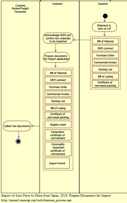 1.The exporter sends seven documents to the importing company (Companies X and P in this case). These documents include the Bill of Materials, Bill of Lading, the Purchase Order, the invoice, the packing list and a certificate of non-wood packing. 2.These documents, plus the registry book, a declaration of entrustment and an entrustment declaration for commodity inspection, are then handed over to the customs broker/freight forwarder. The preparation of these additional certificates will take the company half a day. Documents: -Bill of Material -OEM Contract -Purchase Order -Commercial Invoice -Packing List -Bill of Lading -Export Register Book -Packing List -Certificate of non-wood packing -Declaration certificate of entrustment -Commodity inspection of entrustment -Import Permit