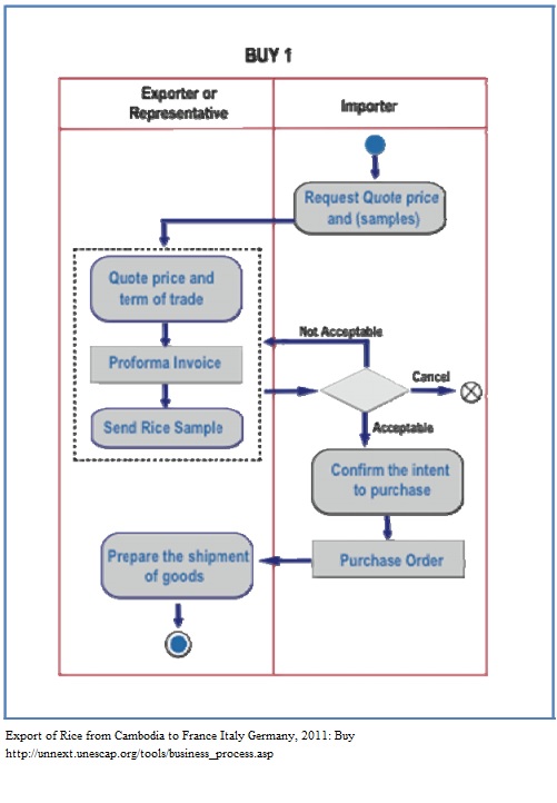 1. The Importer in Europe shows interest in import of rice from Cambodia (See Annex I.1. Sample Letter 1: Request for Information and Quote). In the case of a new buyer, the exporter first sends the quotations to European importer, after which rice samples are usually sent by overnight courier. The importer insists to see the samples due to the vast variety of rice planted in the country. Each type of rice is harvested and available during certain periods of the year and the buying period reflects the cyclical climate conditions and some exporters maintain jealously a list of rice millers, whom they know carry certain types of rice and at what time of the year. However, in the case of a regular client, the exporter quotes prices and terms of trade to the buyer via e-mail. 2. The European importer verifies the quotation and, assuming the payment terms are acceptable to both parties, confirms the intent to purchase. Then a Purchase Order (PO) is sent by the importer/buyer to the exporter/seller by email or by fax. The exporter/seller raises a Proforma Invoice (PI) or a Sales Contract against the PO and send it by email or by fax back to the importer/buyer who is required to countersign. Depending on the understanding/trust between the exporter and the importer the mode of payment varies.(See Annex I.3.1 to I.3.3: Sale Contract) 3. Both parties sign contract which determined the shipping date and commercial terms and conditions, specifically: a. Contract terms: Information on the Goods – Cambodian long grain white rice with max 25 pct broken, moisture max 14 pct, crop 2010 freshly milled and with following specifications:Average length whole kernels 6,45 mm; Broken 30 % max; Chalky kernels ( >= half kernel) 6% max; Red/red streaked kernels 0,60 % max; Yellow kernels 0,10% max; Damaged kernels 0,25% max.76 b. Payment conditions Price: US$ 400.00 (Four Hundred United States Dollars) per metric ton Net, FOB Sihanoukville/Cambodia (Free On Board, Incoterms 2000), in container, including costof GSP Form A certificate and other original shipping documents.77 c. Other terms and specific conditions: Milling degree well milled. Fumigated at time of stuffing the container. All Rice to be sound, loyal and merchantable quality suitable for direct human consumption, without alien taste/odor, without warehouse smell in milled rice after cooking, free from alive weevils, and free of their larvae at the time of loading. Rice to be fit for immediate human consumption, and to be free from chemical and all other substances noxious to health. No metal or glass admixtures, and no dead rodents and lizards are allowed to be in bags with rice. No cocoons allowed inside rice. No plastic strings and other plastic admixtures allowed. Residues of pesticides not to exceed the international standard, organic admixtures max. 0.20 %, mineral impurities max. 0.10 %, heavy metal contents not to exceed the international standards. Rice to be milled from non-GMO paddy. Exact quality to be the same or better than sample sent to buyers via ABC & Co in April 2010. 4. The Cambodian exporter prepares the shipment for export