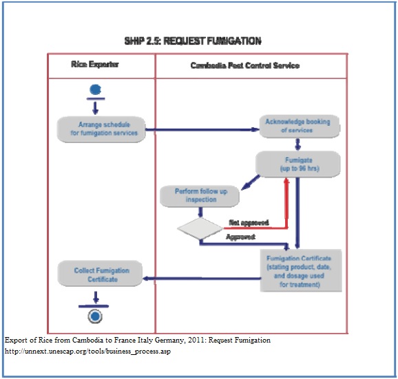 1. The Sanitary and Phytosanitary Certificates (“SPS Certificate”) are required when exporting rice to most countries and depending on the risk factor. Plants are classified into low risk and high risk categories. Low risk plants usually include rice and grains. High risk plants like banana or sugar palm trees typically have high moisture content. Soil becomes an important factor in the risk assessment. 2. The MAFF/Department of Agronomy and Agricultural Land Improvement (“DAALI”) is responsible for issuing the SPS certificates, which certifies that the product is free from quarantined pests and significantly free from injurious pests which could damage crops. It is the exporter’s responsibility to ensure that the SPS conditions are met. For this the exporter submits an application to the MAFF/DAALI in Phnom Penh, which will issue the SPS Certificate. 3. The SPS application process involves the following steps: The exporter submits a letter requesting SPS certification, along with the packing list and invoice, and for DAALI officers to inspect the rice shipment. His request specifically mentions the buyer’s requirement as per the Purchase Order. “Contract terms: FUMIGATION : Fumigation final at time of stuffing the container as per official certificate issued by competent authority, mentioning fumigant type and dosis. Fumigation only allowed with aluminium/ magnesium phosphine.” 4. DAALI makes a risk assessment based on the risk for pests, the source of origin of the rice, the testing and inspection requirements of the importing country, and determines the export requirements and guidelines in Cambodia. Normally DAALI will arrange for fumigation, if needed, at least 15 working days before exporting. The full process for fumigation can take up to 96 hrs. The exporter usually do the follow up directly with the MAFF authorized fumigation company. A Fumigation Certificate is then issued. The certificate states the product, date, and dosage used for the treatment. The product is now SPS certified and ready for export
